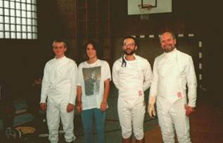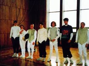 Training für das 1. Treffen mit den Fechtern in La Roche sur Yon. Mike Smyth, Thorsten Mühl,Petra Happ, Maitre Dugauquier, Andreas Rostalski und Elke Wilke.