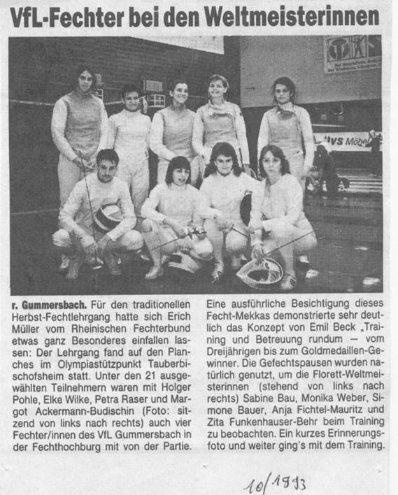 1993 In den Osterferien findet ein einwöchiger Lehrgang im Leistungszentrum Bonn statt, unter Teilnahme der Gummersbacher Fechter. Einige Anfänger konnten die Leistungsprüfung ablegen.