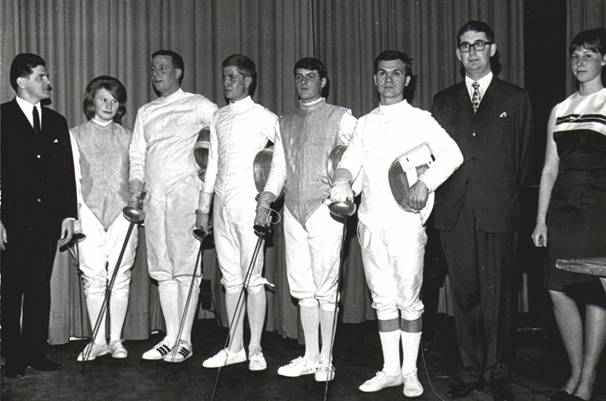Balduin Kitzia, Roland und Regine Schmidt. Die Gummersbacher Fechter mit Klaus Anschütz, Ulli Herzog, Ehepaar Schmidt und Balduin Kitzia.