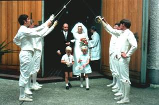 1970 (Juli) Hochzeit von Elisabeth Osberghaus und Jürgen Woelke in der Kirche von Lantenbach. Großer Auftritt der Fechtabteilung. Siehe nachstehende Fotos.